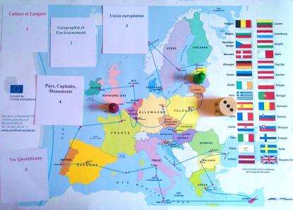 Afin de faire découvrir les différents pays européens, une carte géante (4mx4m) est à votre disposition. Elle est totalement modulable: que vous vouliez faire découvrir les sportifs européens célèbres, faire connaitre les stéréotypes (et expliquer s'ils sont vrais ou non), les spécificités et spécialités culturelles... cette carte permet de très nombreuses possibilités.