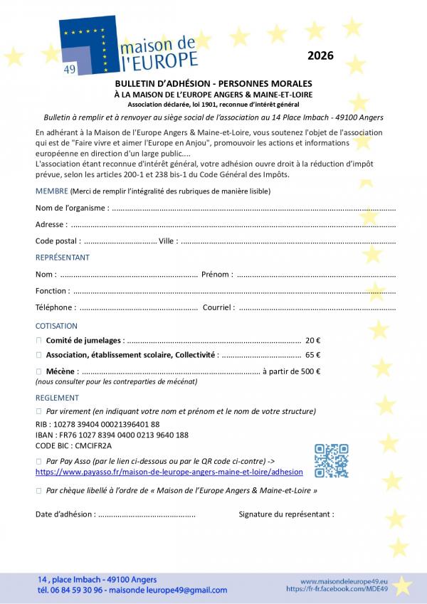 Fondée sous la dénomination "Association pour la Création de la Maison des Européens à Angers", le 16 décembre 2005, l'association régie par la loi du 1er juillet 1901 porte la dénomination de "Maison de l'Europe Angers et Maine-et-Loire", suivant décision de son Assemblée générale extraordinaire en date du 2 avril 2008 et celle du 24 mars 2011.