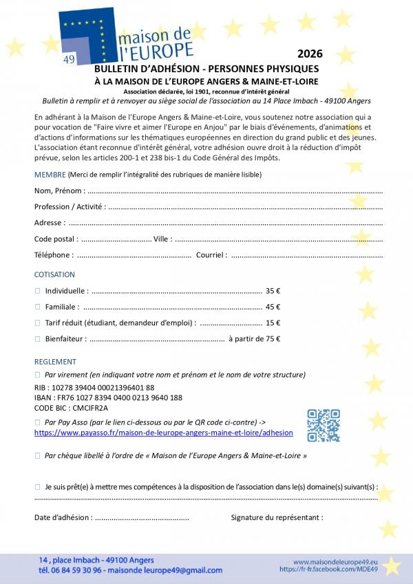 L'association est composée de femmes et d'hommes de tous âges et de toutes catégories socio-professionnelles. La Maison de l'Europe Angers & Maine-et-Loire est indépendante de tout parti politique.
