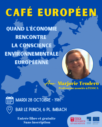 Ce Café européen sera animé par Marjorie Tendero, professeure d’économie à l’ESSCA, membre de l’EU*Asia Institute et éditrice de l’ouvrage « The European Environmental Conscience in the EU – Finance, Innovation, and External Relations of the EU ».