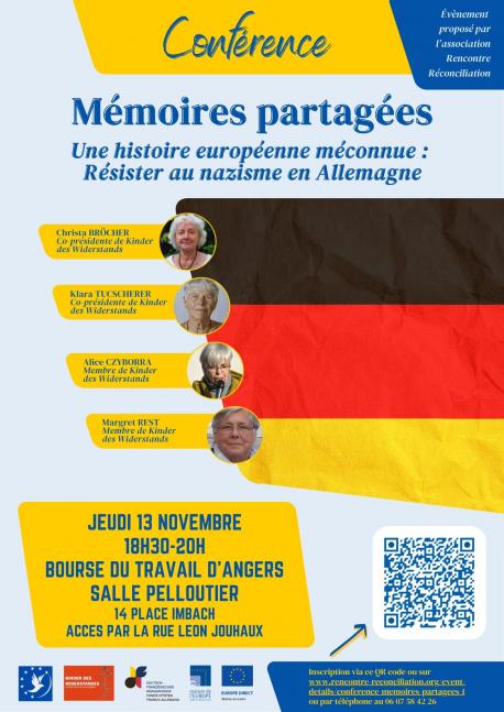 Cet événement se déroulera le jeudi 13 novembre de 18h30 à 20h à la Bourse du Travail d'Angers (salle Pelloutier - accès par la rue Léon Jouhaux). Cette conférence vous fera découvrir les récits de descendants de résistants allemands (Kinder des Widerstands) et vous permettra d'échanger avec les intervenantes lors d'un temps de questions-réponses.